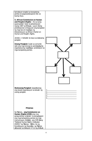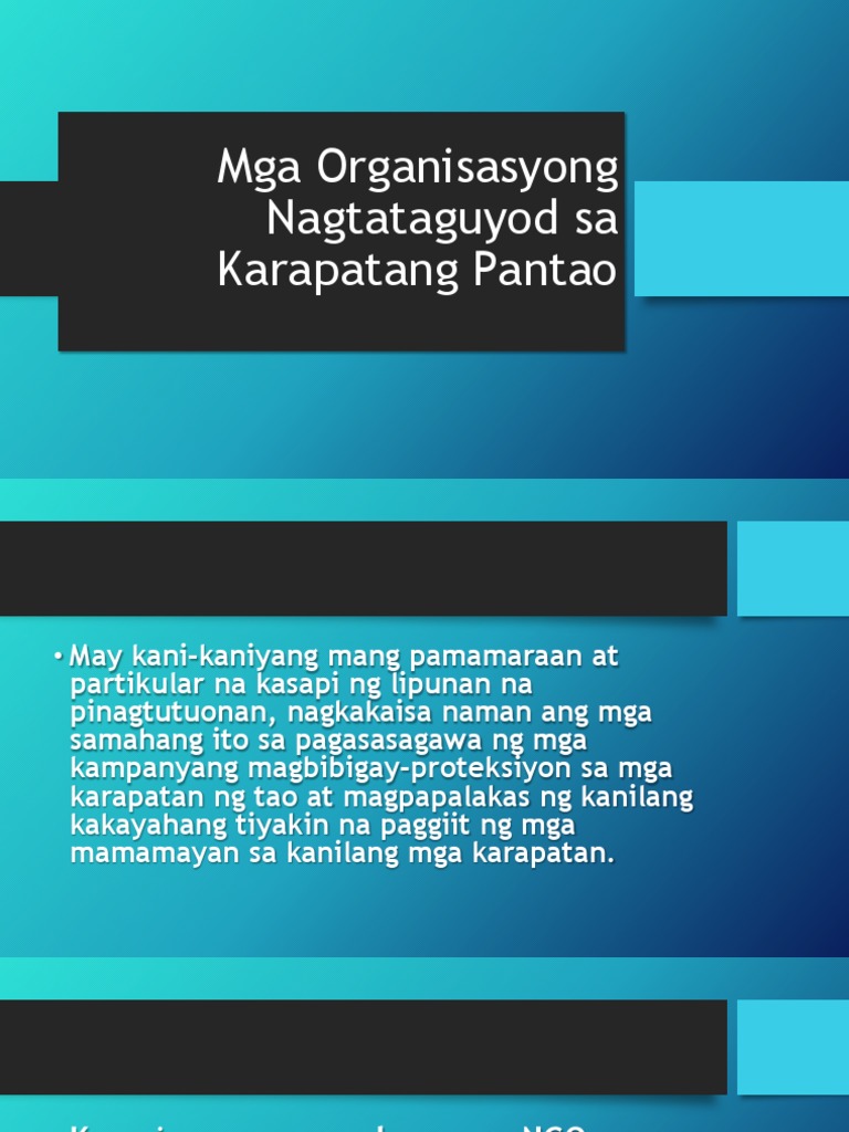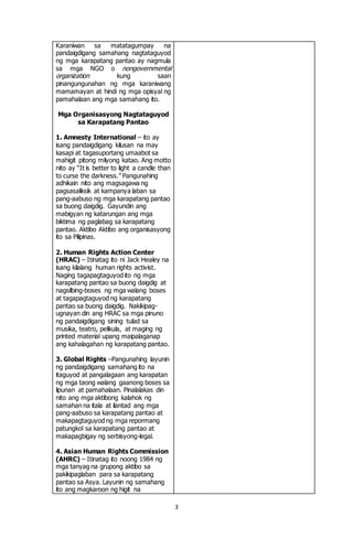 Up to 3 cash back Layunin. Natatalakay ang ibat ibang organisasyon pandaigdig man o pambansa Nasusuri ang adboksiyang binibigyang-tuon ng bawat organisasyon. Up to 3 cash back ito ay isang pambansang grupo ng mga human rights lawyer na nagtataguyod at nangangalaga ng mga karapatang pantao.