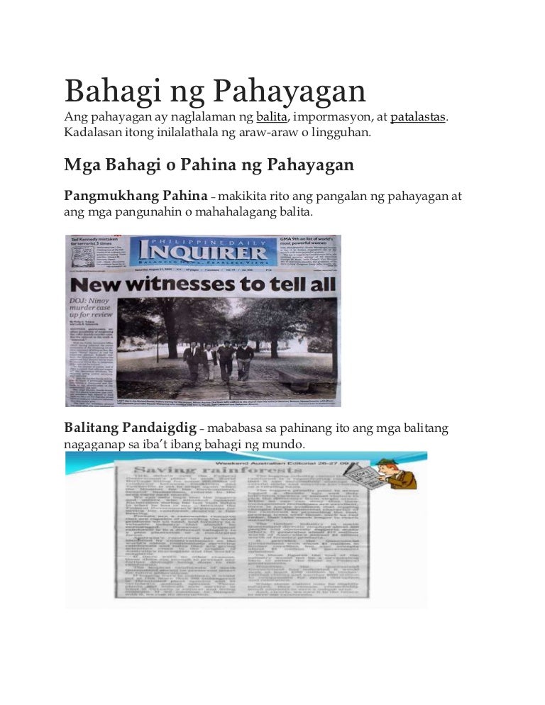 Bakit mahalagang malaman ang nilalaman ng bawat bahagi ng pahayagan. Mga Bahagi ng Pahayagan. Isang uri ng paglilimbag na naglalaman ng balita impormasyon at patalastas at kadalasang inilathala sa araw araw.