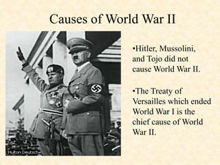 Sanhi ng Ikalawang Digmaang Pandaigdig Tunggalian ng mga. Ng US laban sa Japan. Nasisiyasat ang naging papel nina Hitler Mussolini at Tojo sa pagsiklab ng Ikalawang Digmaang Pandaigdig.
