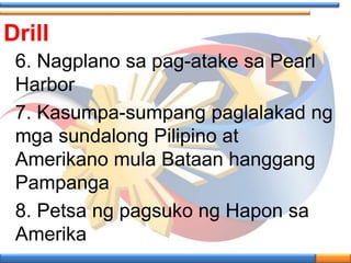 Pananakop ng mga Hapon Hamon sa Pagsasarili Presented by. Karagdagang BalitaCGMA pansamantalangnakalaya sa kanyangHospital Arrest sa VMMCmatapos magpyansa ng P1milyon. Malaking bilang Ang namatay at nasira Ang mga ari-arian.