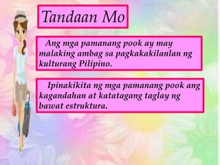 Ang isang Pandaigdigang Pamanang Pook World Heritage Site ay isang pook tulad ng gubat bundok lawa disyerto bantayog gusali lungsod atbp na itinala ng Kapisanang Pang. Tandaan Mo Ang mga pamanang pook ay may malaking ambag sa pagkakakilanlan ng kulturang Pilipino. Ipinakikita ng mga pamanang pook ang kagandahan at katatagang taglay.